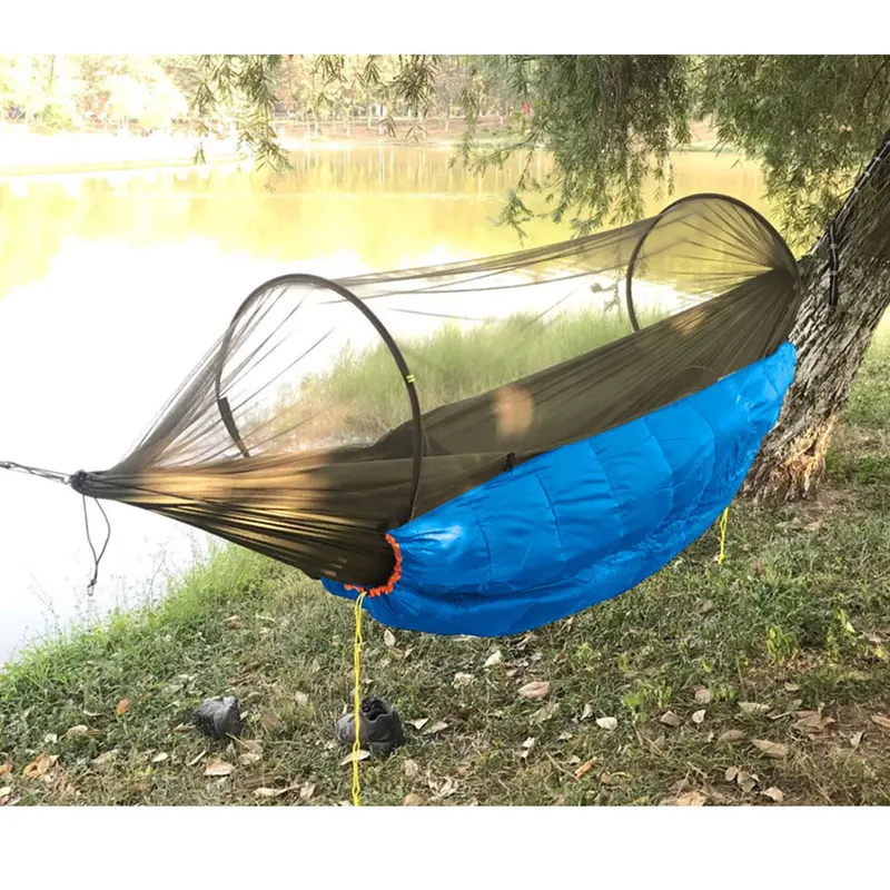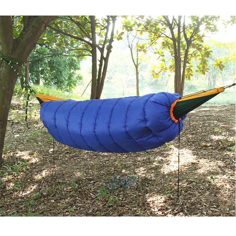 ผ้านวมเปลญวนนี้มีเชือกกันกระแทกที่จะช่วยลดความหย่อนคล้อยของเขื่อนกั้นส่วนท้าย ขจัดจุดเย็นใต้ขาและไหล่ของผลิตภัณฑ์ ปรับเปลี่ยนได้ง่ายโดยการขันปลายเชือกแต่ละด้านให้แน่นแล้วปิดในคืนที่อากาศหนาว หรือปลดปลายทั้งสองข้างออกจนสุดในวันที่อากาศอบอุ่น ทำให้สะดวกสบายกว่าเบาะรองนอนเปลญวน